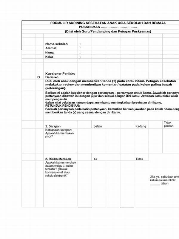 Mengisi formulir skrining kesehatan anak sekolah adalah langkah awal untuk mendeteksi dini masalah kesehatan yang mungkin dialami anak. Proses ini memungkinkan pihak sekolah dan tenaga medis untuk mengetahui informasi kesehatan dasar dari setiap siswa. Begitu formulir ini tiba di tangan Anda, saatnya untuk memperhatikan detail yang tertulis.