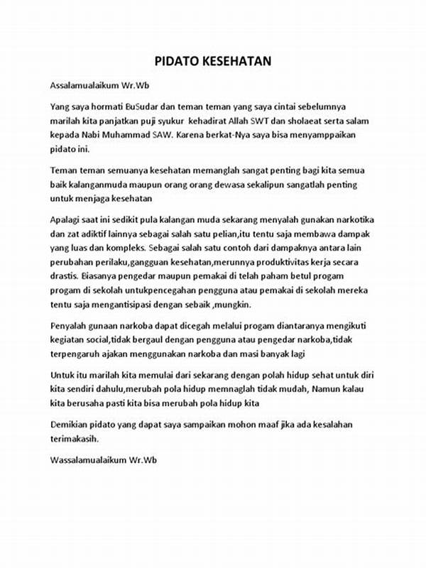 Pidato tema kesehatan memegang peranan signifikan dalam mempengaruhi perilaku kesehatan masyarakat. Dengan berbagai gaya penyampaian dari formal, informal, hingga ekspositoris, seorang pembicara harus mampu meramu pidatonya menjadi narasi yang mencerahkan sekaligus menggugah. Selain itu, penting untuk memanfaatkan elemen storytelling dan testimoni nyata agar pesan dapat lebih menggaung.